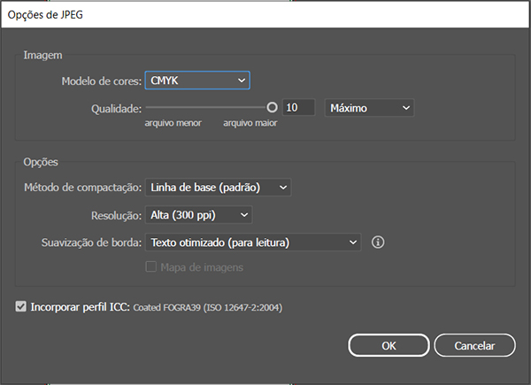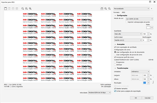Nas opções de exportação do formato .jpg observe para que estejam sempre iguais as abaixo, com exceção é claro, do tamanho da página que vai depender do seu arquivo e opção de compra.