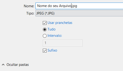Na opção de Tipo de arquivo, selecione a opção JPEG (*.JPG), e mantenha o usar pranchetas selecionado: