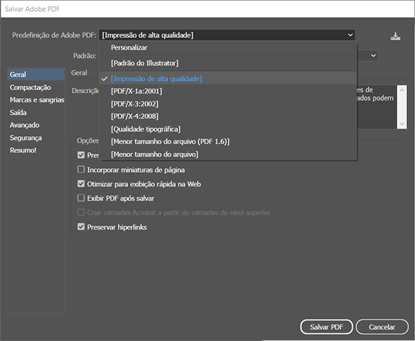 2 - Nas Predefinições de Abobe PDF, selecione a Impressão de alta qualidade;
