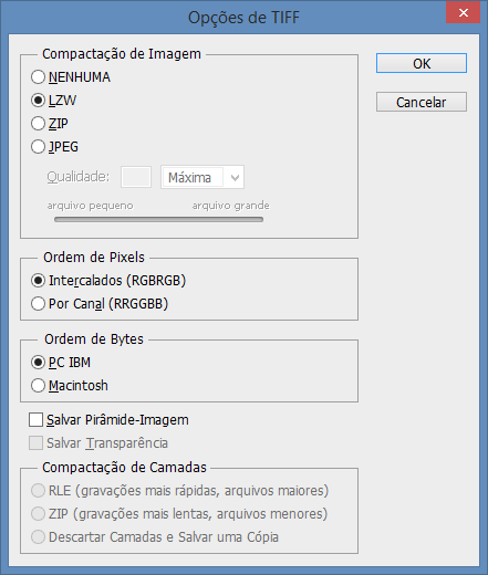 Para o caso de utilizar o Photoshop, utilizar os padrões de salvamento abaixo e sempre utilizar os formatos TIF ou JPG.