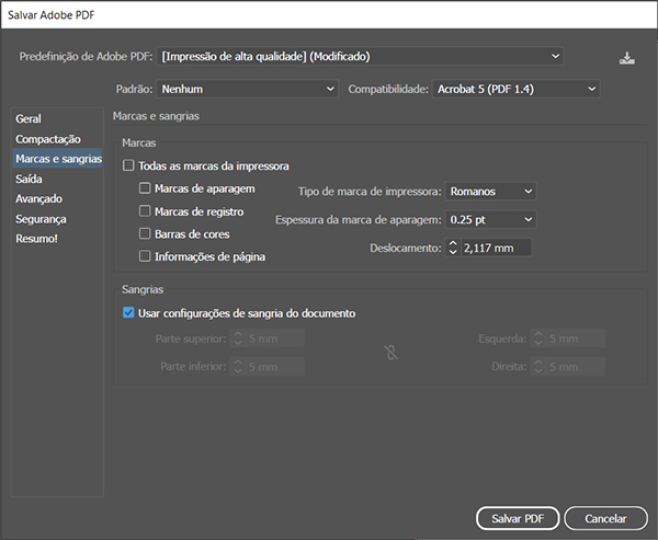 3 - Na aba de opções selecione Marcas e sangrias, e selecione usar configurações de sangria do documento, para manter as suas configurações de sangria, que devem estar com 5mm para cada lado conforme descrito anteriormente nas nossos recomendações;